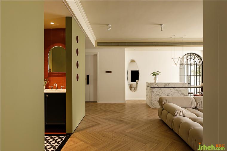 清新的橄榄绿色清新的橄榄绿色(色号:多乐士 70YY25/200)由玄关延续至卫生间,家装设计将空间进行打破与重组,实现一个室内的整体模块承担不同功能分区(玄关+干区)。