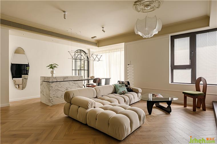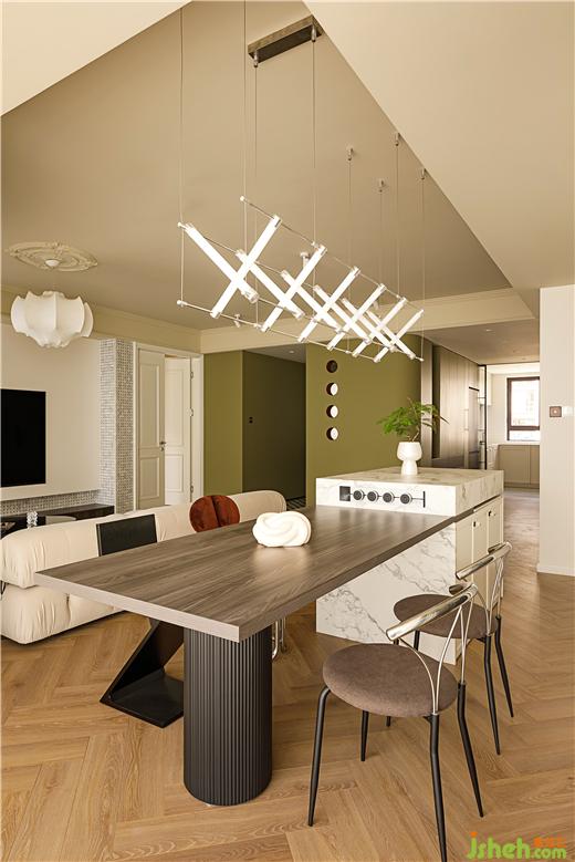 客餐厅保持原始2.75米层高以及横厅优势,整个客餐厅拥有大平层的既视感;家装设计用乳胶漆做墙顶分色处理,拉伸视觉效果,同时增加整屋的层次感;同时古典的蚕丝等增加空间的柔软度,整体和谐自洽。