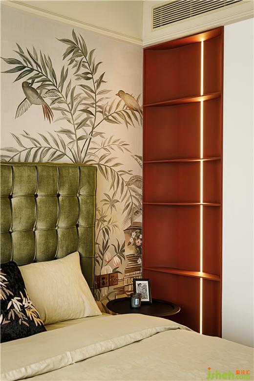 入户玄关,家装设计师选用带弧度的转角,和橄榄绿为一种视觉冲击,既在风格上跟整屋保持一致,也能在功能上满足收纳,同时干区卫生间有个链接;玄关柜用上下分体的设计,用黑色作为腰线,颜色更高级,同时也能在腰线处设计一个摆放花瓶的位置;