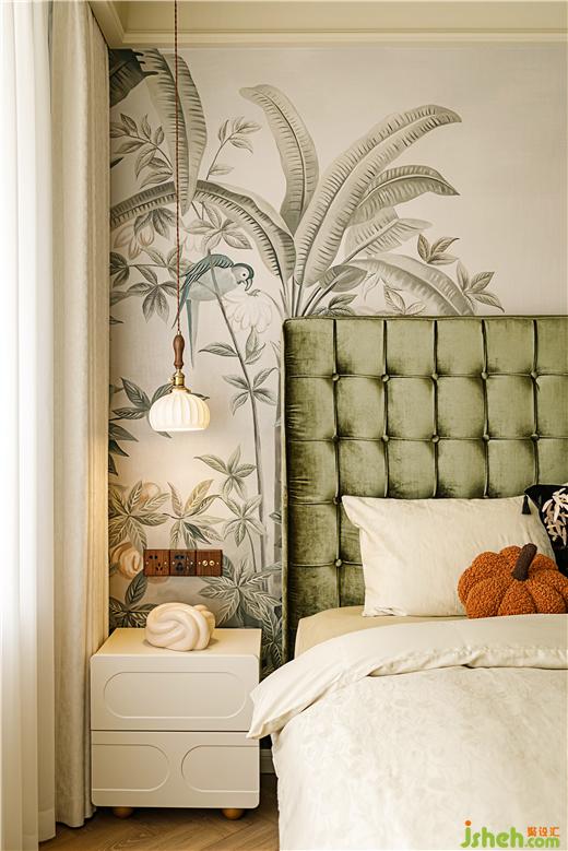 主卧的整体以雅致为主,白色的线条搭配花式的壁纸,层次感丰富,同时与业主喜好的黑色柜体门板相呼应,复古与精致兼备。主卧室空间尺度有限,家装设计将储物功能全部集中在了衣帽间。