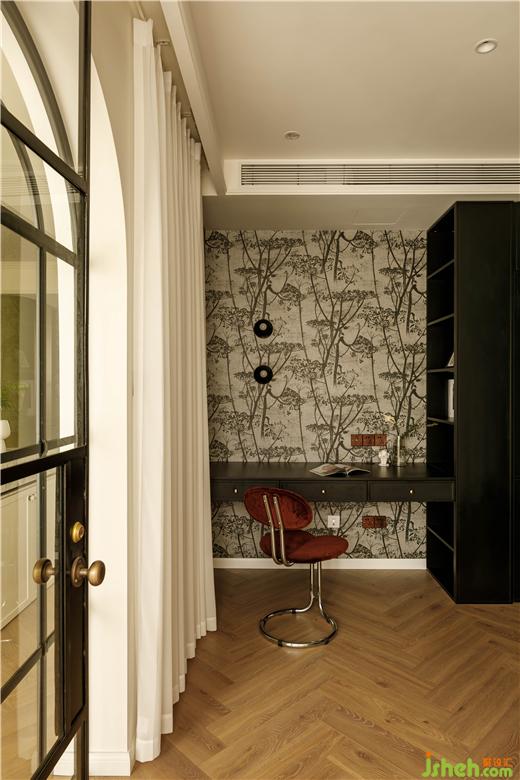 原有卧室,暂时规划为多功能房间,供男业主做独立书房使用,我们希望书房必要太闭塞,尽量保证空间通透感,所以将两侧墙面非承重区域打通,家装设计保证最大化采光与通风条件,用“老钢窗”隔而不断,铁艺材质加上弧形门洞造型结合,古典气息浓郁,同时预留了窗帘,保留卧室居住属性。