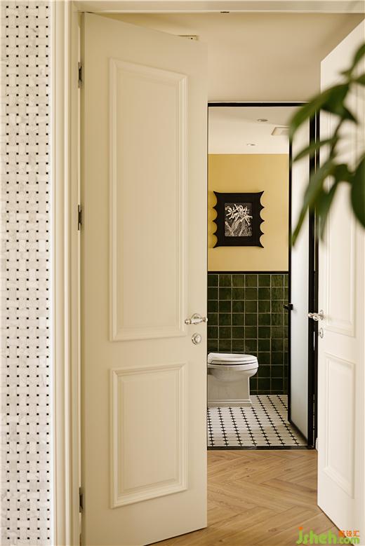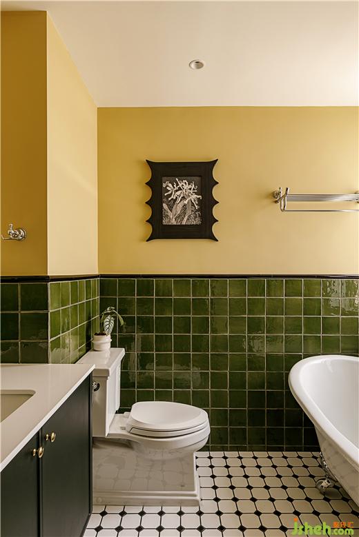 干区作为客厅的“一部分”,延续橄榄绿和黑色的组合,在花色上注重复古的质感,满足日常洗手以及洗衣的简单需求。