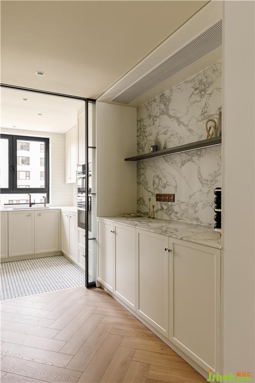 衣帽间运用拱形门+金属质感的拉手五金,家装设计营造了一份独有的法式优雅;同时在柜体的材质选用了模压板,带线条的层次,衣帽间多了几分庄重。