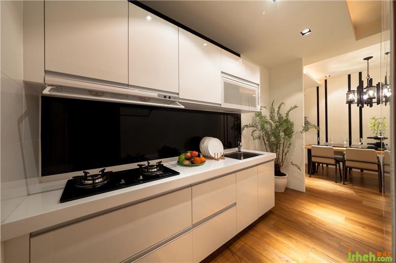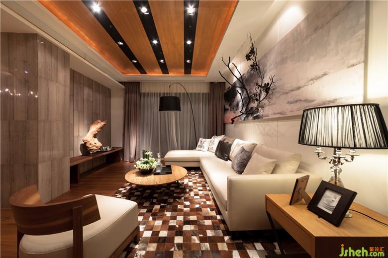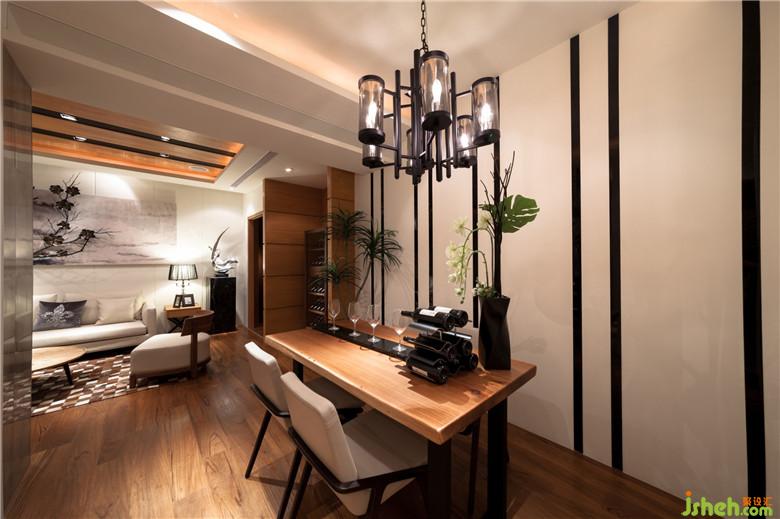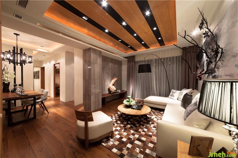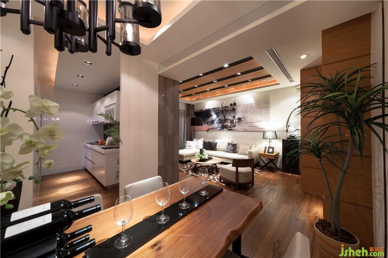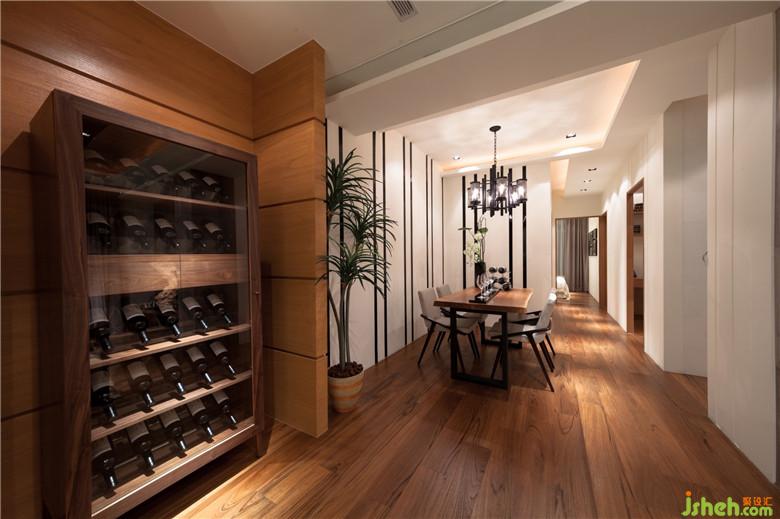本案为住宅空间,并以木质作为空间主要用材,场域之间以白色和木色来界分,并将厨房独立出来,和公领域区隔,空间中大量使用木质媒材,由外铺陈入内,除了给人稳定的力量之外,更显得沉稳大器。沙发背墙上晕染的水墨画,为客厅带来些许东方气息,让整体木质空间更形沉稳,将角度移至黑色天花,线板营造空间强烈的视感,为客厅场域带来视觉焦点,线条区隔阵列于餐厅和走道壁面,将黑与白揉合至完美。走道轴线上,木色门框点缀了白空间,轻氛围有别于客厅的沉稳。