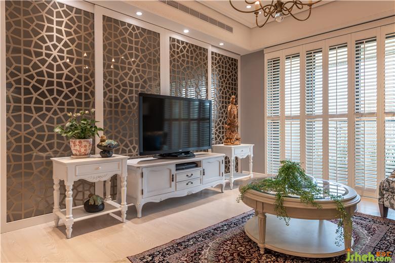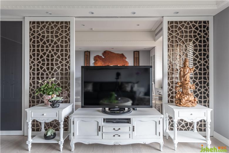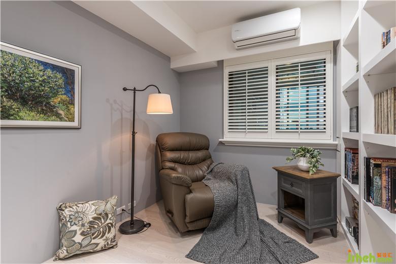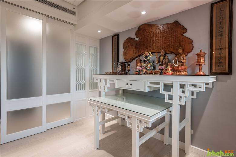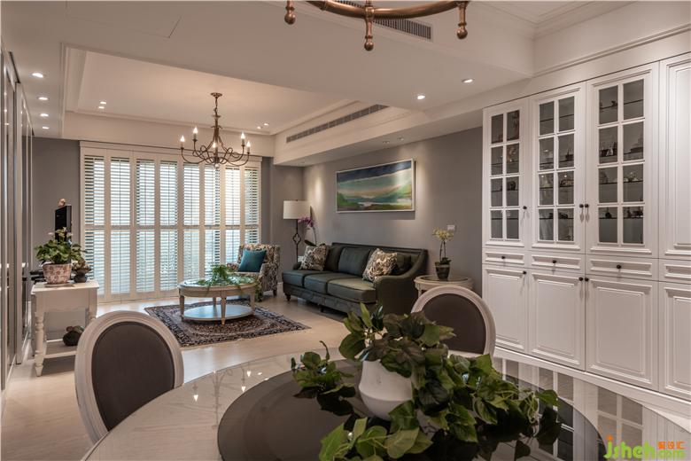 屋主夫妻年屆退休之齡,遂選擇此一機能便利且擁有絕佳視野的新居,打造自在優雅的熟齡生活。因此設計者在全室所有空間尺度上,包含走道與工作陽台等皆以最貼合使用者生活習慣,以及可因應未來各種可能性的規格予以規劃。由於原有4房隔間導致空間過於壓迫,在盡量不做大幅度變更的前提下,將其中一房改為禮佛區並以推拉門為界定、書房也採用玻璃格子門取代實牆,而原本屈居角落的封閉廚房,亦藉由活動拉門的半開放設計和客餐廳產生互動,整體的通風和採光都大為提升。此外,為將戶外的光與景納入室內,盡可能減少實體隔間牆的阻斷,改以彈性推門及玻璃為介質,呈現更敞朗的空間感。開放流暢的場域裡運用純白為基調,壁面融入低明度的淺灰,佐以精緻典雅的線板層次,各角落融入畫作點綴,圍塑出清新雅致的美式風情。装修设计