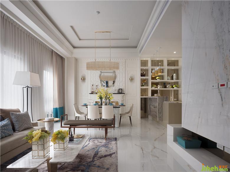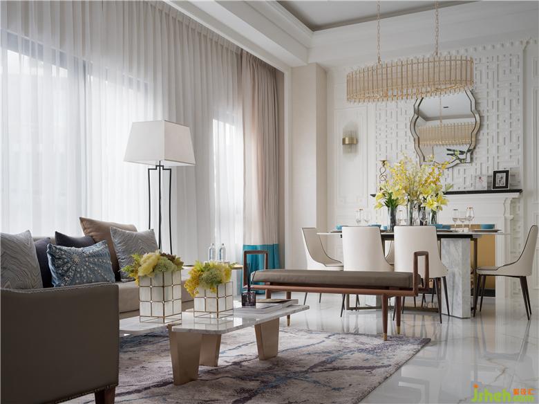 以米白色为主色调,点缀些金色围塑轻奢优雅的质感,搭配屋主喜爱的孔雀蓝色调,铺叙华而不奢的时尚新古典。穿过深咖啡色大理石门斗,开阔视感浮现于眼前,瞬间能感受到明亮采光的雅致公领域,每个家具软件都是精心挑选搭配过后的成果,由低至高低调塑造层次感,餐厅主墙以东方韵味的客制纹路与线板交织,搭配西式线条造型镜面及绚烂高雅的水晶灯,映衬出华美时尚的清丽风情。装修公司
