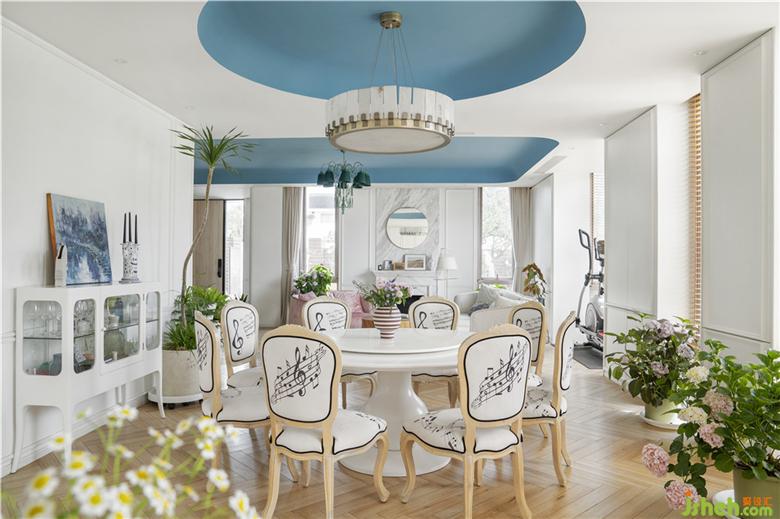 侯胤杰敏锐捕捉到女主人对辽阔海域的向往,明媚的蓝只是线索,与之相伴的开阔与通透才是Ada钟情的内核。于是,设计师将一楼的非承重墙体全部拆除,一层空间呈现完全开放的姿态,天花板上的两块小小“海域”,方型对应客厅,圆形对应餐厅。吊顶边缘都细细打磨出精致的弧度,模仿常年被海水冲刷后的光滑边缘。