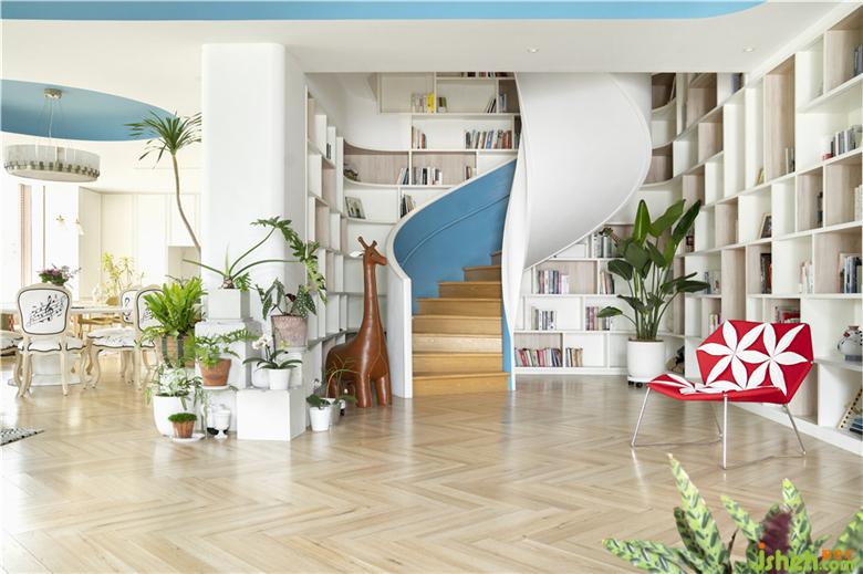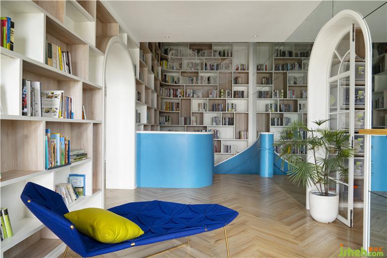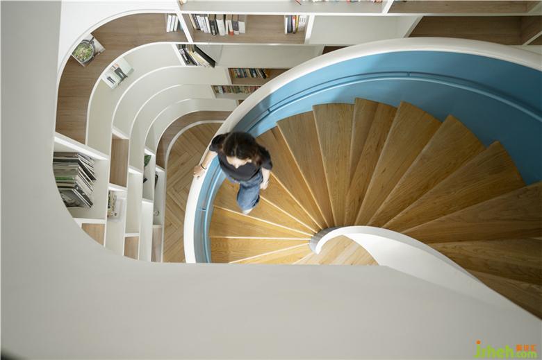 别墅设计从一楼整壁延伸到二楼的巨幅书架,围绕着楼梯布局,木色和白色的木格,大大小小错落而设,与楼梯色彩形成呼应,自带跳跃的节奏感。贯穿二层楼的楼梯。带有韵律感的弧线盘旋而上,白色的外轮廓卷着海蓝色的底色翻涌而上,四周围绕着书海,意境就很美。