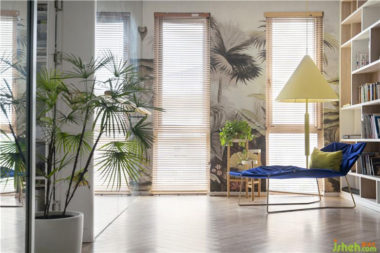 楼梯上来是一片面积不大的休闲区,方便主人找到心仪的书时可以快速阅读。艺术躺椅边一盏巨大的黄色Maison Dada吊灯垂下,落地书架伴着棕榈树壁纸的叶影婆娑……这里依旧是一副海岛度假的惬意模样。