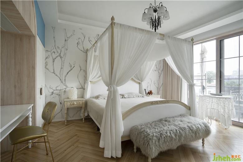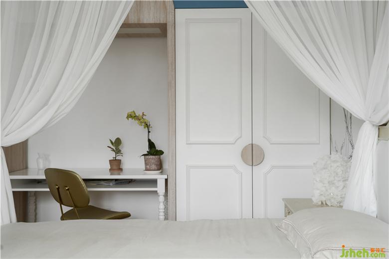 兼具浪漫与实用的主卧,紧凑地设置了连体墙柜与梳妆台。