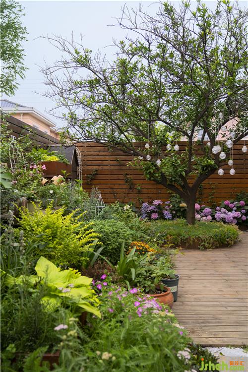 整个庭院都是Ada的专属,花叶繁盛、光影温柔,防腐木墙围合出一方美妙花境,主人用大大小小的盆栽和不同的花器打造出错落有致、四季皆美的园景。