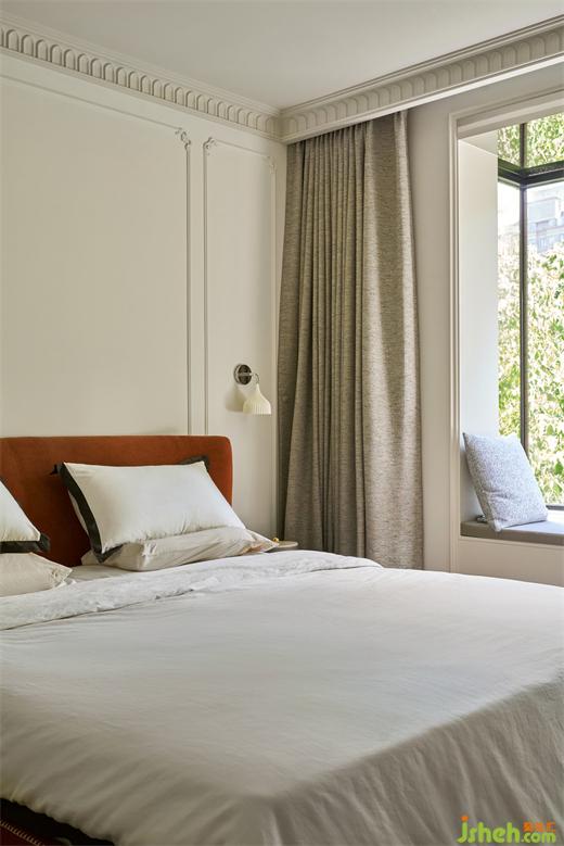 主卧的格调清新而自然,同时又保有一种简约的浪漫,没有过多的修饰,顶部用简约的法式线条勾勒出空间的韵味,同时通过围合式的通透飘窗,将曼妙的自然景观引入室内。