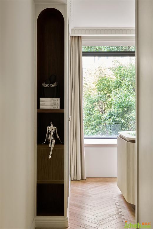 主卧室内配有专门的衣帽室,衣帽柜、首饰柜、展示柜等一应俱全,另外,还将飘窗区打造成一个休闲观景的多功能区域,体现出居者生活的尊享性和自由舒适性。