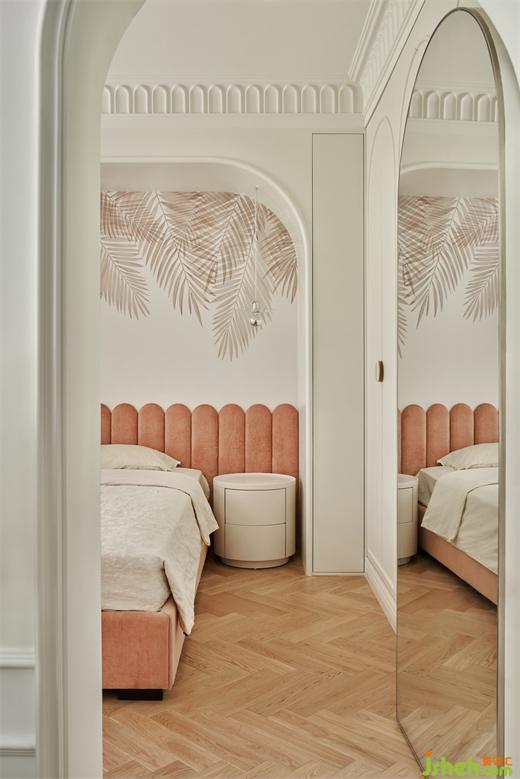 女儿房的打造则加入了浅粉的色调,晕染出空间的柔和和优雅,简约法式线条与彩绘壁纸相结合,丰富空间的画面感。