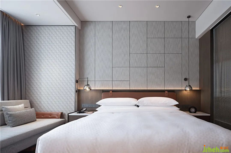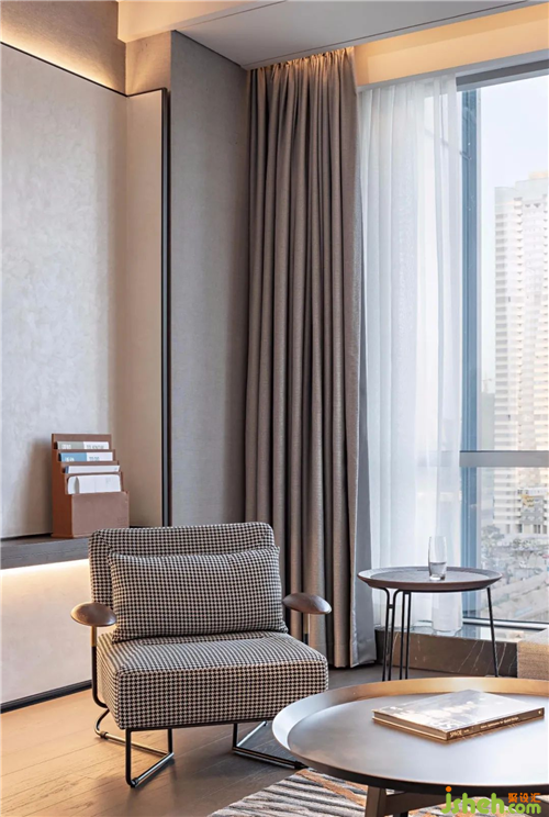 千鸟纹的靠枕与撞色地毯为空间增加时尚与灵动之意境,当客户在一天疲惫后回到房间,褪下疲惫静享时光的美好。