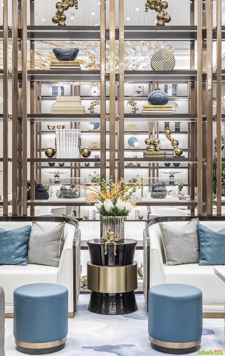 再者,情景空间在精心雕琢的平面比例下,创造出协调的参观和沟通路径。无论是画墨般的蓝灰地毯,还是金属铜艺术装置,这个空间以绝对纯粹的姿态,展示了自然人文的和谐之美。而在软装配饰上,为凸显现代时尚,沙发面料方面融入了经典的Dior戴妃包格纹纹理,进一步加强了内部空间的格调气质。