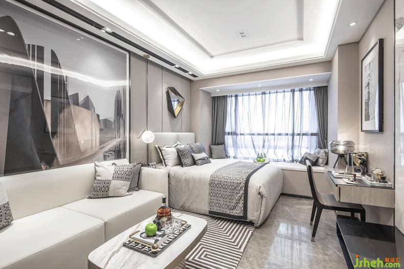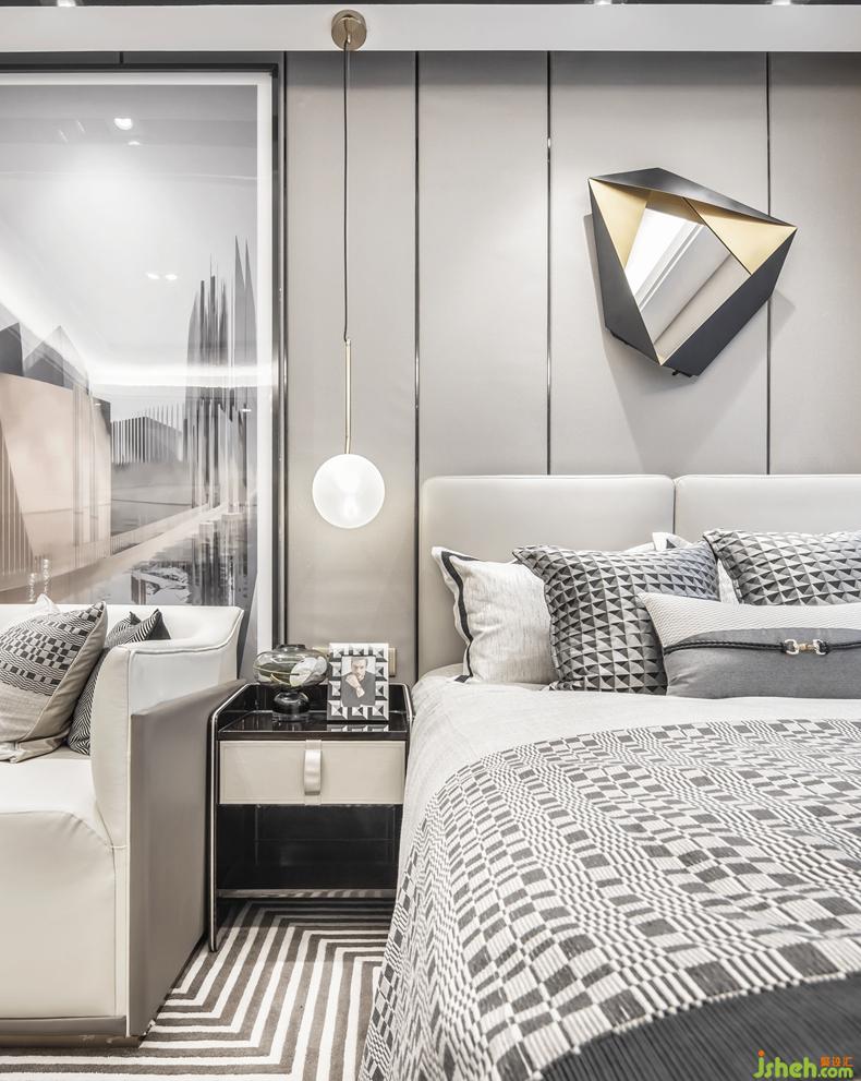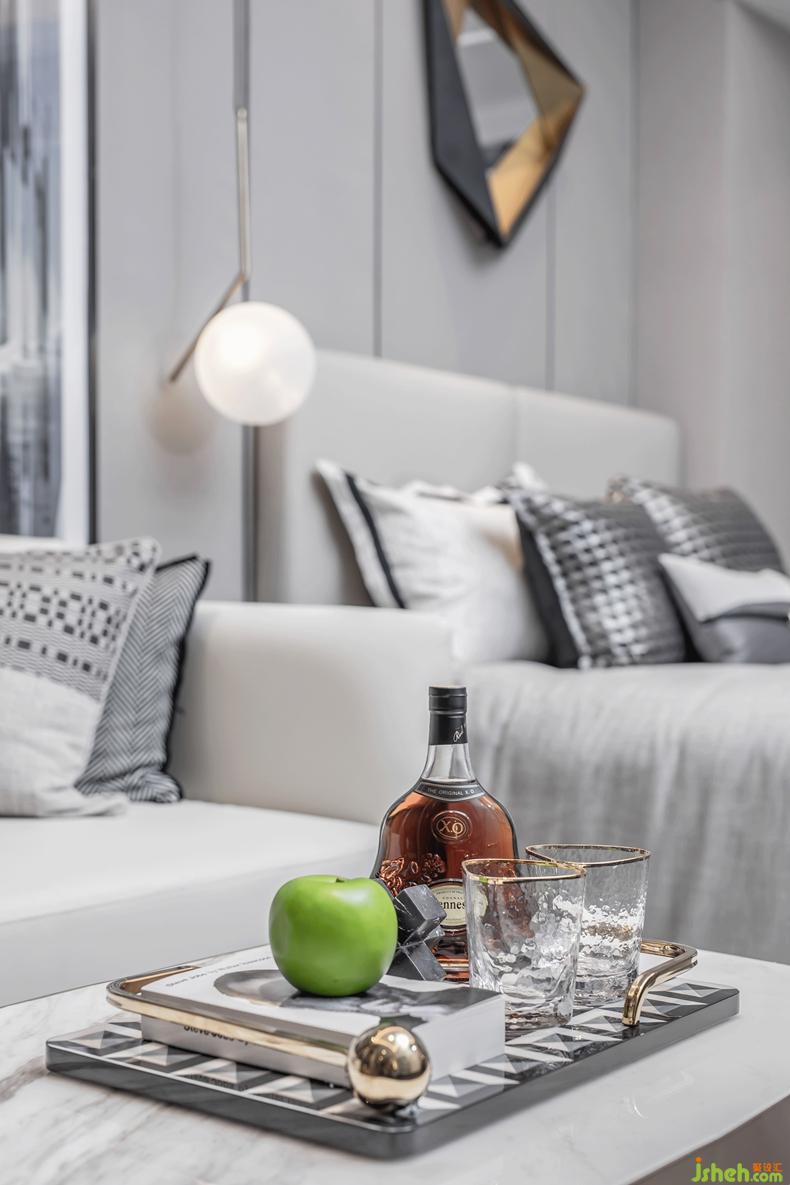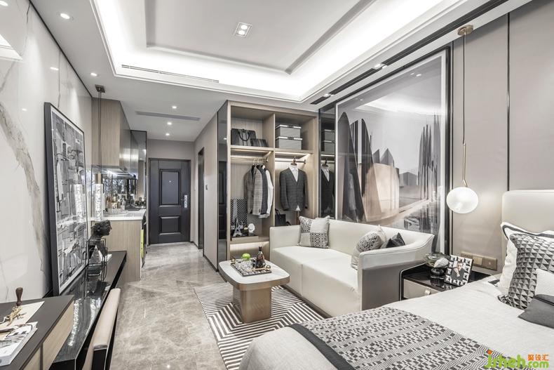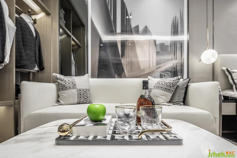 室内设计师创作中最为巧妙的一点是利用衣柜隔断空间,并根据元素的不同区分差异性;客厅所具有的规整性严谨感,都是通过建筑画、几何纹理、威士忌酒文化所打造出来的奢华高雅,不同于至简至奢的入口处,也不同于悠然随性的卧室。