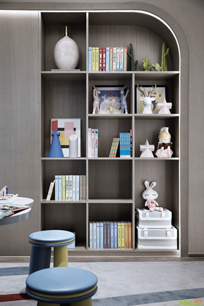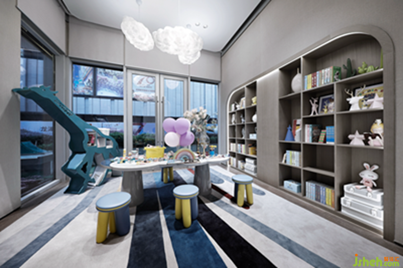 对于儿童娱乐区,更多考虑的是如何不干扰孩子们创造力与活泼性,因此设计从装饰细节、色彩搭配上着手,不规定曲直平衡的界限,用发散思维的构想,为孩子们提供一个丰富多元的空间环境。