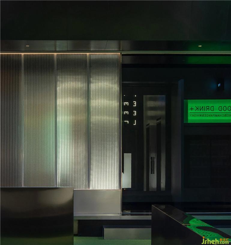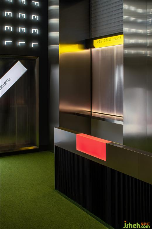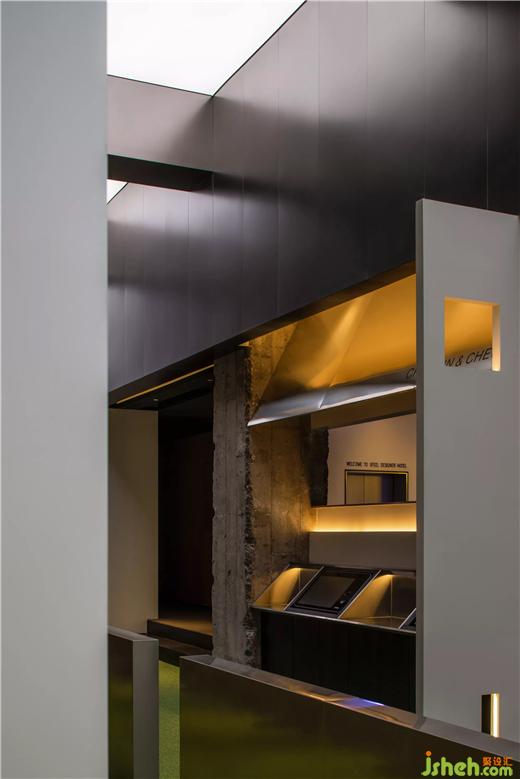 入口电梯厅以一面整洁的金属墙打开,设计师酒店设计端景运用平面设计的语言将酒店英文名称以不同方式进行排列。