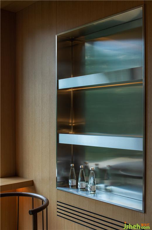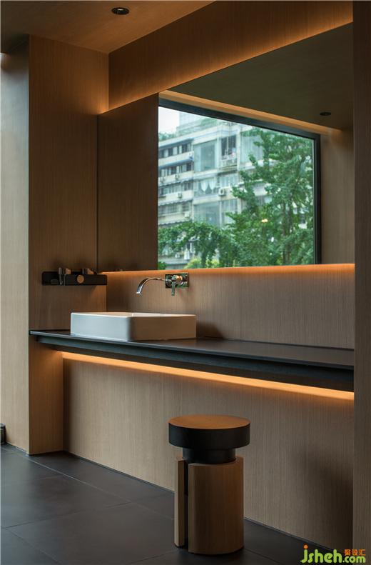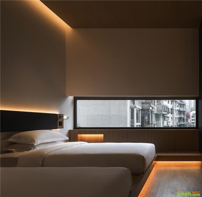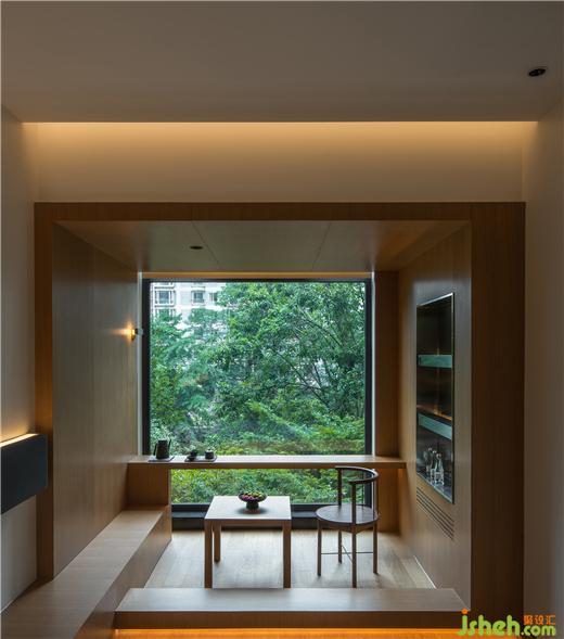 通过开窗面的限制,运用框景的手法将室外景观整理收纳后引入室内,设计师酒店设计这种有限定性的“框景”在室内看出去时,屏蔽远端的楼宇,使人更专注于绿色景致带来的宁静。