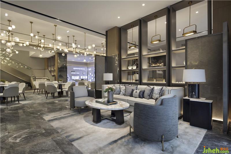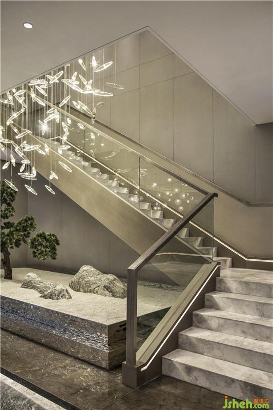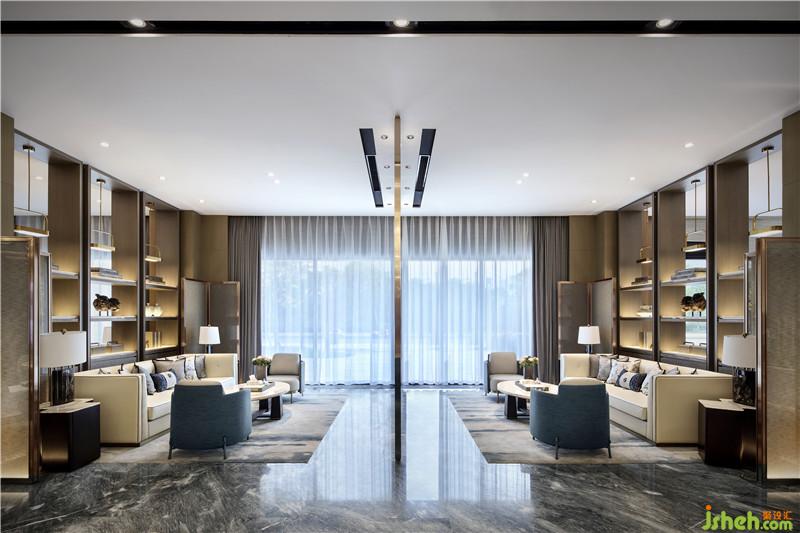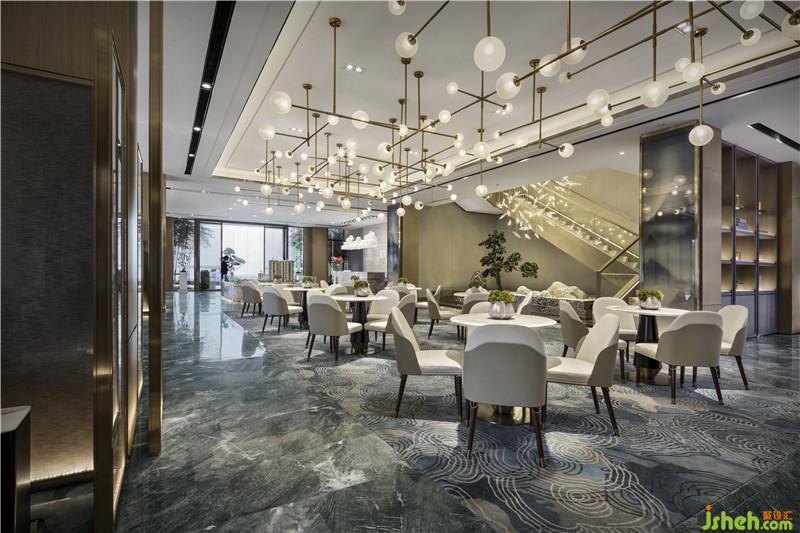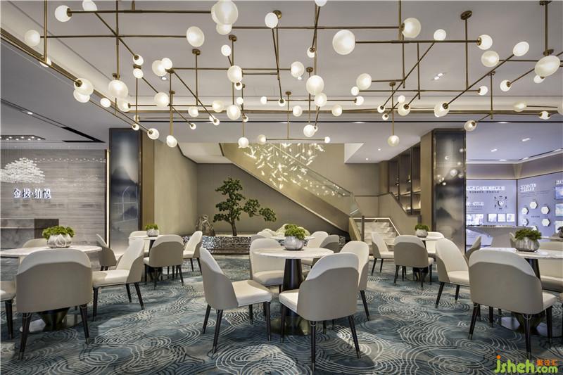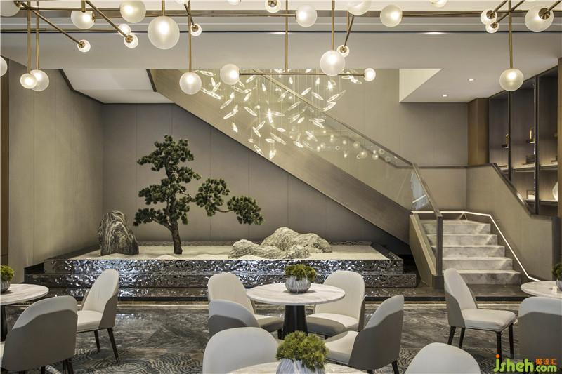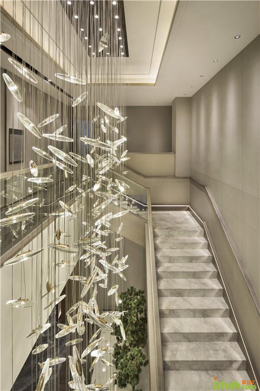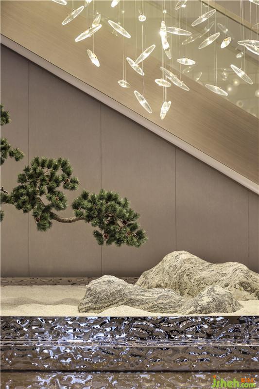 “万丈洪泉落,迢迢半紫氛。奔流下杂树,洒落出重云。日照虹霓似,天清风雨闻。灵山多秀色,空水共氤氲。”银泉飞瀑跌宕而下,铿锵有力,疾风骤雨,亦真似幻。腾空而起的缥缈水气,烟雾缭绕,一派迷蒙与虚无之境。“天地氤氲,万物化醇”,提取庐山瀑水之韵、之形、之气、之神,铺洒在空间各个角落,孕育乾坤交合的生命意境。设计公司
