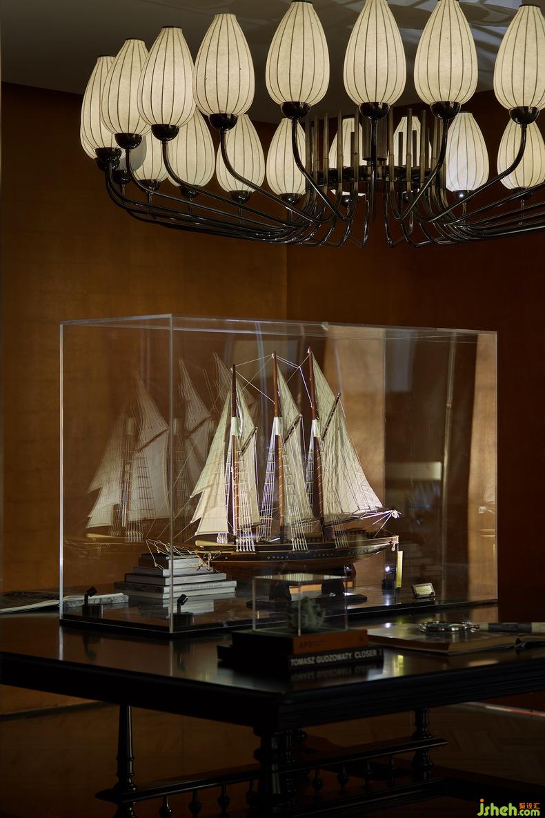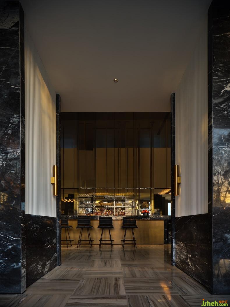 延续着空间敞朗的尺度关系,洽谈区中部垂悬而下的硕大亚克力装置,以弥合空间体量上的疏阔感受,围合水吧展开整个洽谈区的视野,成为了空间视觉关系的中心。
