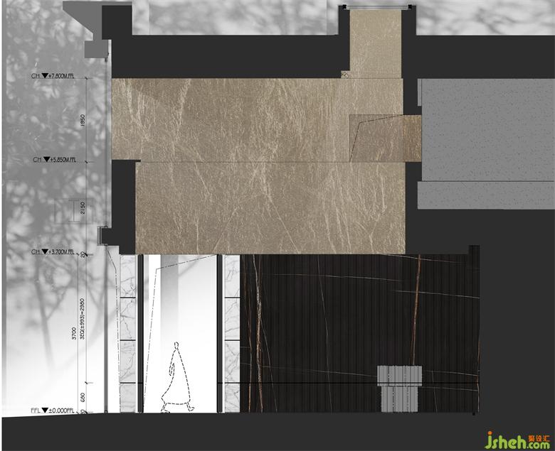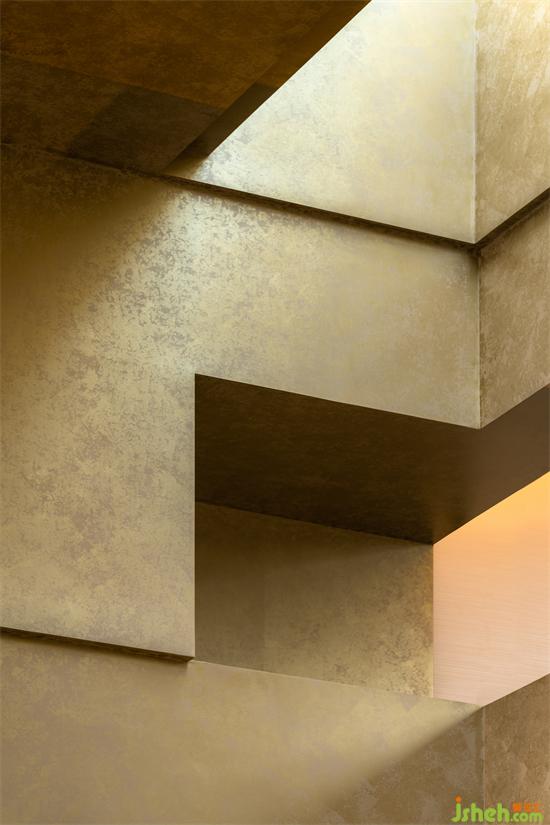 主要材料: 金属漆、木饰面、岩板、亮光铜不锈钢、金箔