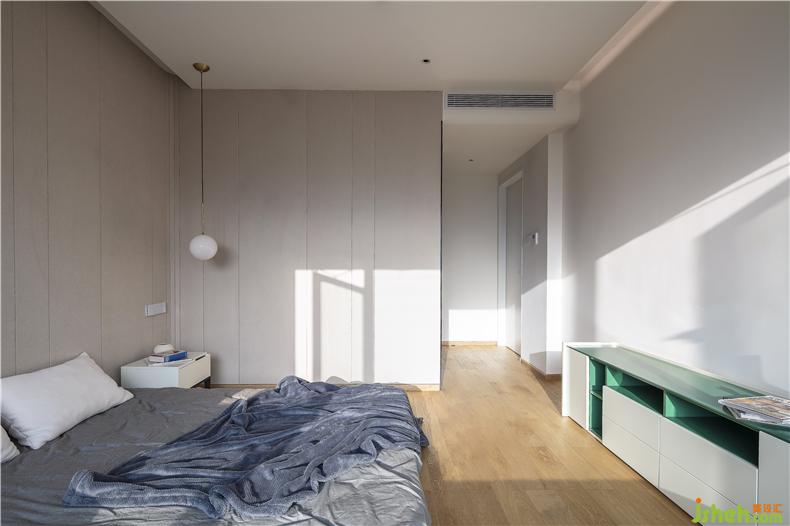 早晨的第一缕阳光洋洋洒洒地落到地板上,点亮主卧和我们新的一天。