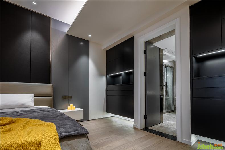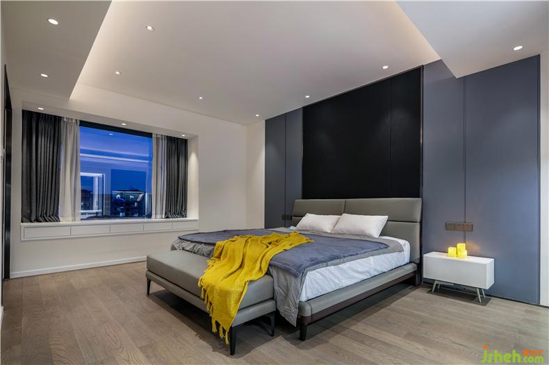 The master bedroom in grey and blue tone continues the basic tone of space and is simple and elegant. Large area windows make the space more open.