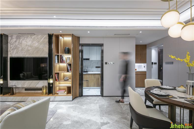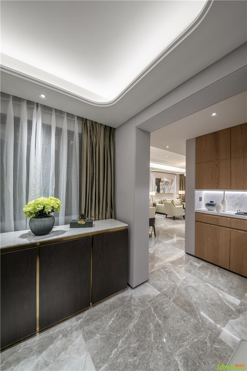 玄关用深色与铝合金的搭配凸显了质感,半遮掩的玄关有着一股中国风的韵味。
