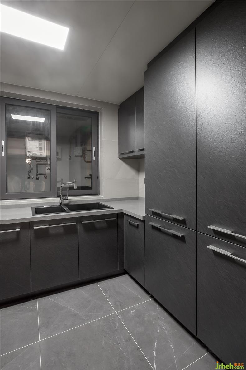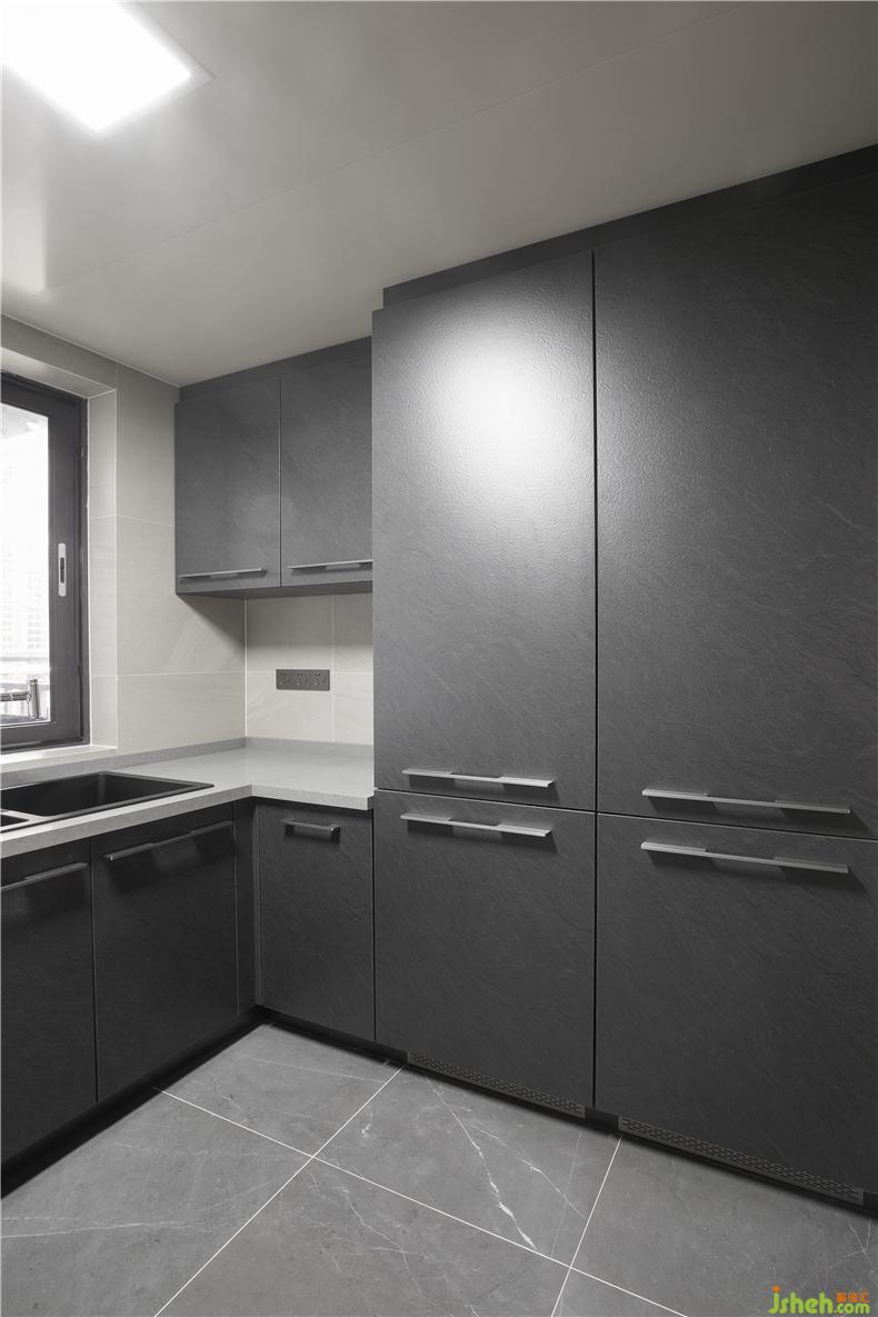 厨房始终追求的是干净,整体依然选择一体式定制设计,灰色安静色。橱柜为多开门的设计,大方简明。