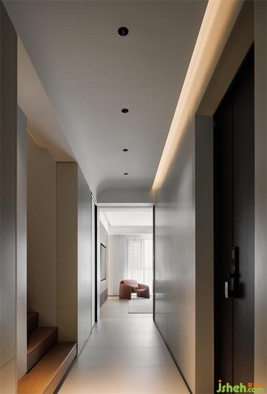 原楼梯步宽窄,我们利用鞋柜的厚度延续,增加每步步宽,并在此基础上加了一个踏步,复式装修设计以此减缓每一步的高度。
