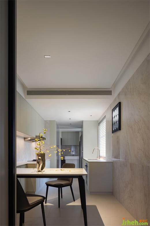 原始结构中,餐厅没有采光,于是我们将餐厅和厨房连通,复式装修设计让厨房的采光得以引入餐厅。