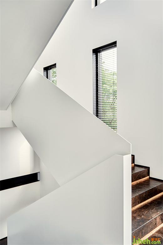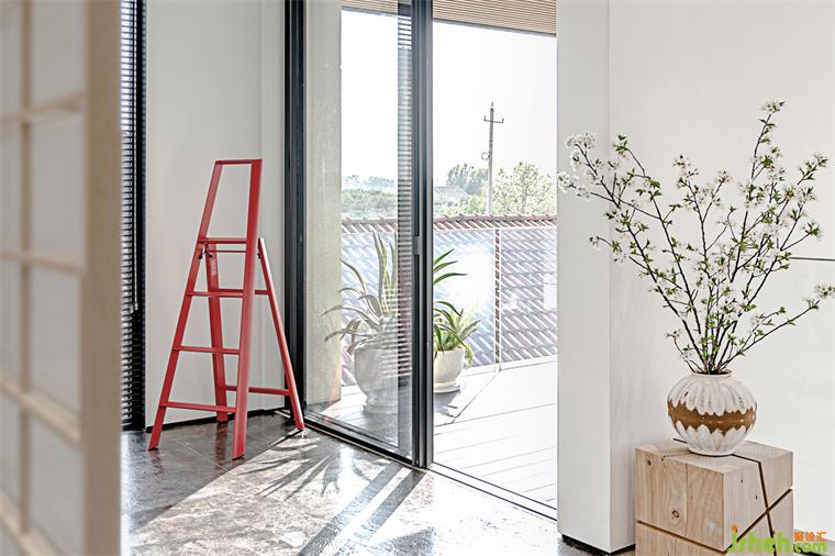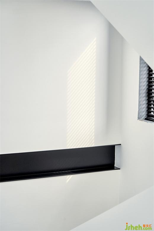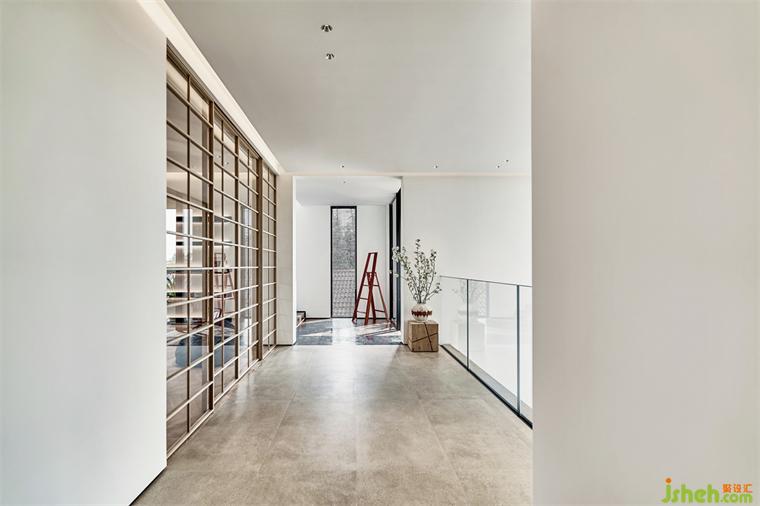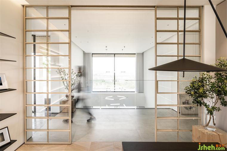 步入二层长廊,舒适温润的气质延续演绎。连接书房和楼道的木格栅,以镂空设计控制光线的明暗,轻盈清透的玻璃,引借自然光映亮居室。
