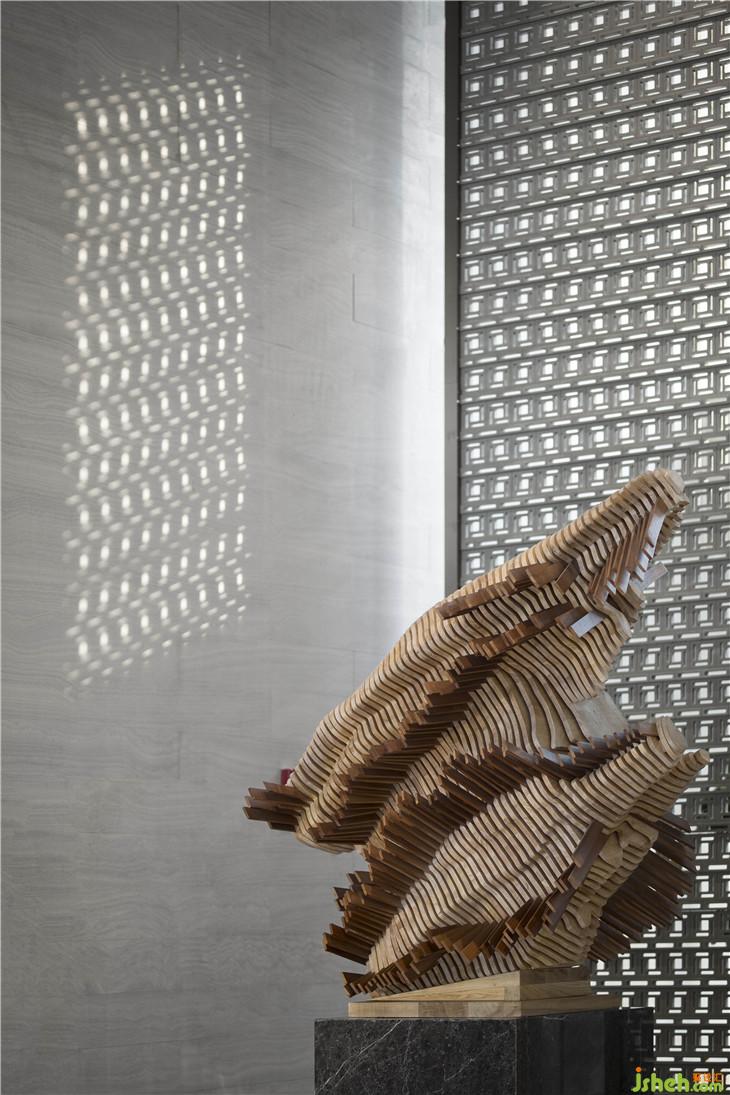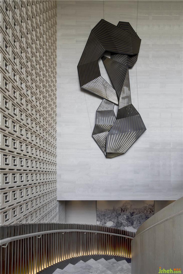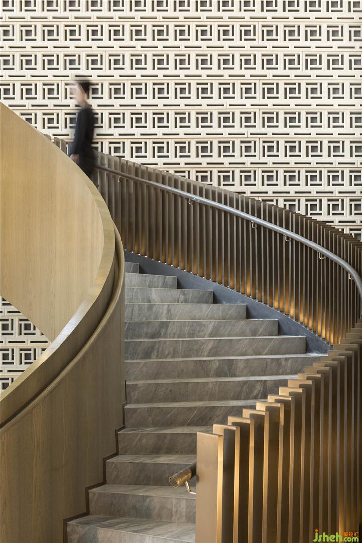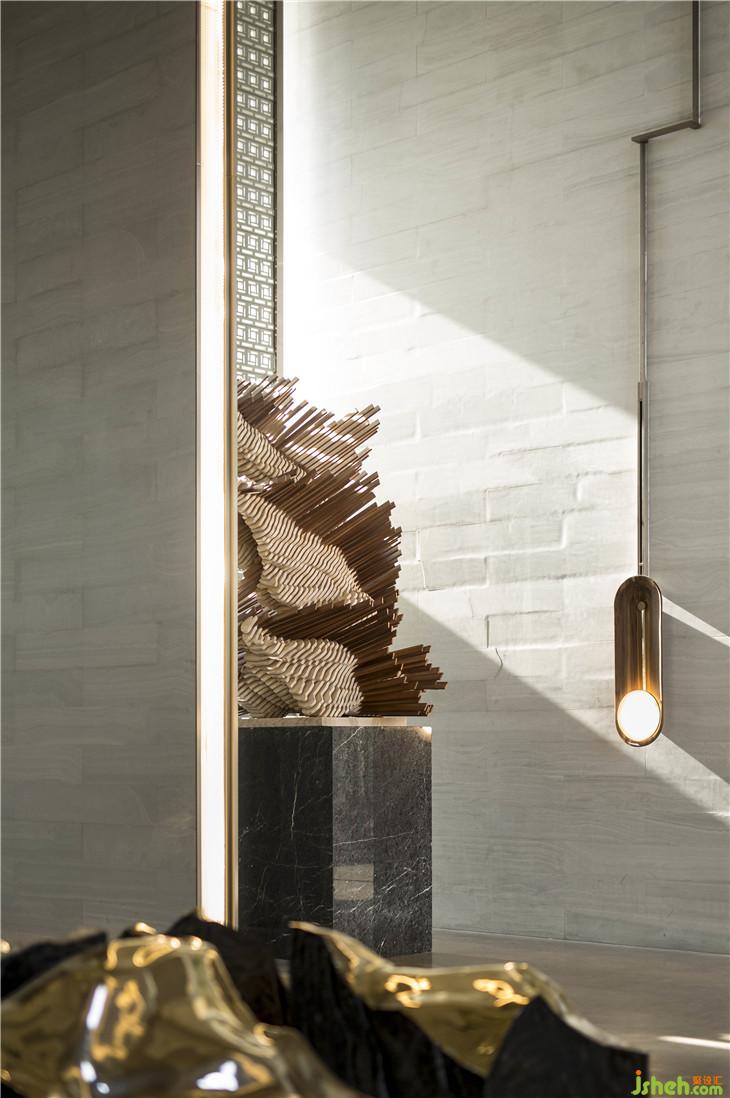 沿着动线行进、转移,步入会所区,域漏窗式的墙体紧密连结室内的景观楼梯与室外的秀木绿林,一步易景,移步亦景。古铜色的旋转楼梯运用不对称设计,一面是不锈钢材质,一面是疏密有序的木栅,自然的质感与艺术的精奢融为一体。而艺术吊灯则像是翠玉质地的黑胶唱片,唱针沿音轨悄悄回旋,细细呢喃着万物生长的声音。室内设计师