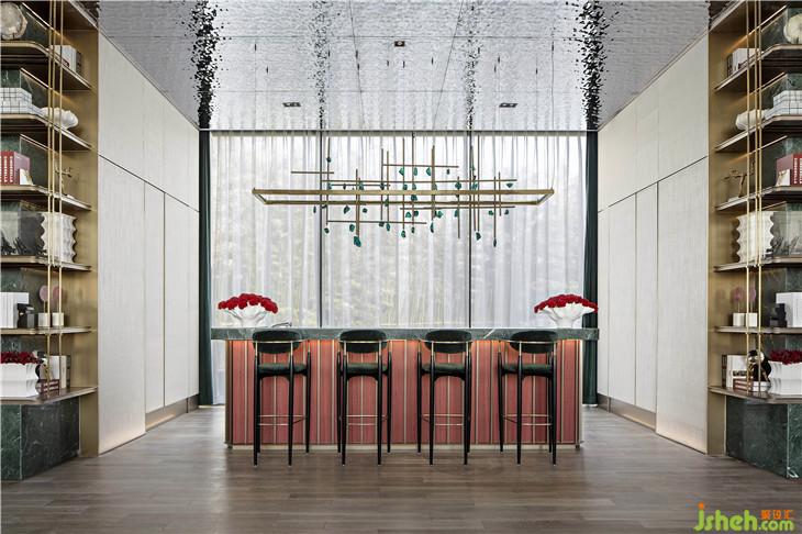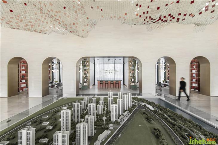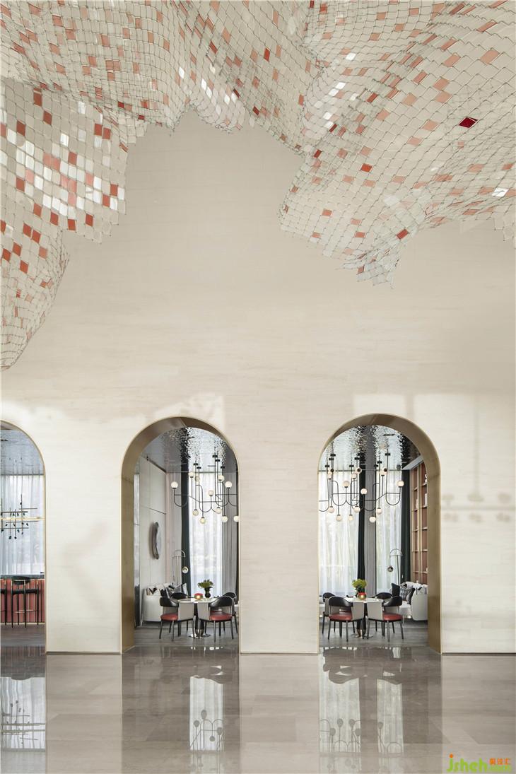 设计师以拱门元素打造整座开放式空间,使区域之间的过渡自然流畅。艺术装置旋绕于沙盘区上方,仿佛从湖泊蒸腾而起的水雾,完成腾空,如云缕飘摇,探索着感官认知与想象空间的边界。室内设计师