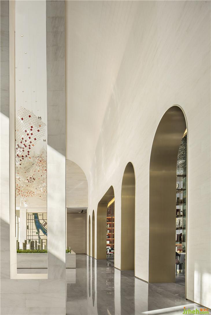 艺术长廊呈现了艺术的景深和时空的梦境,一扇扇拱门营造着端庄的序列感和层次感,节奏缓慢地带人穿越艺术隧道,穿越宫殿红的壁墙,回望烟波浩渺的历史长卷。室内设计师