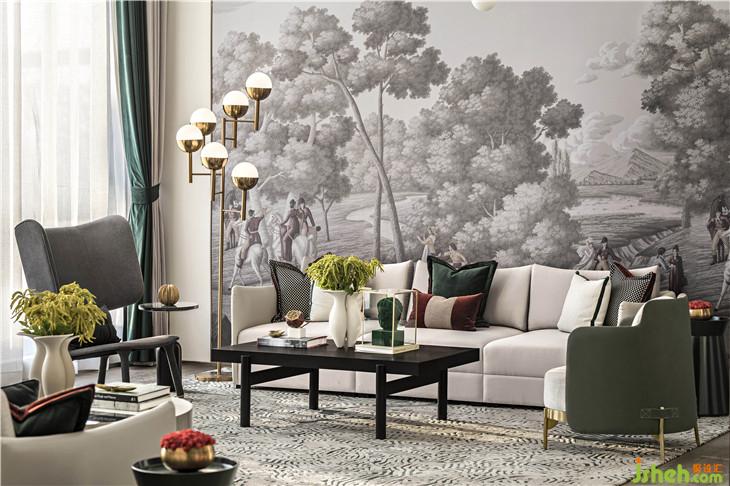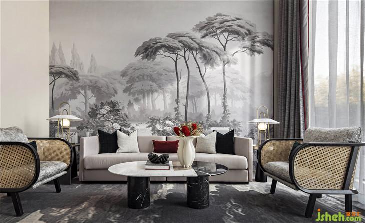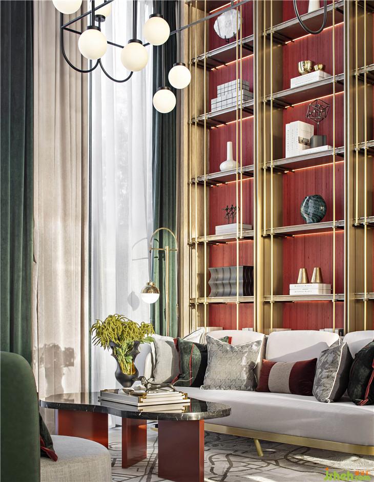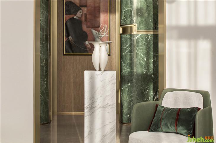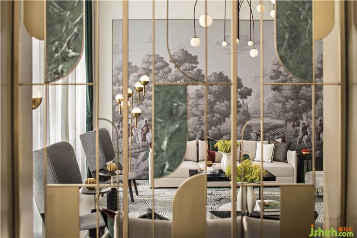 顶上的镜面照应出原始自然,清澈又模糊的镜面如同闪动着粼粼波光的河流,濡染着镜下的风景。宫殿红与翡翠绿皆是至高无上王权的代表,二者历来是经典搭配。室内设计师