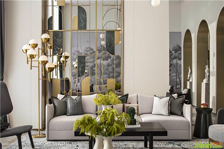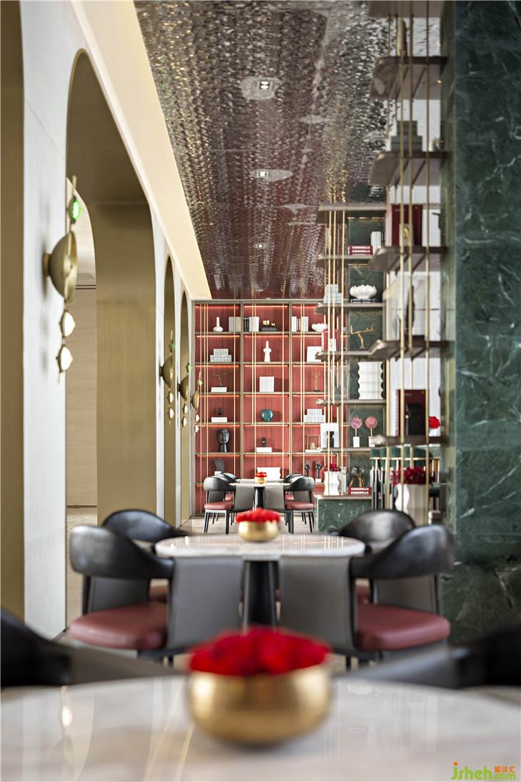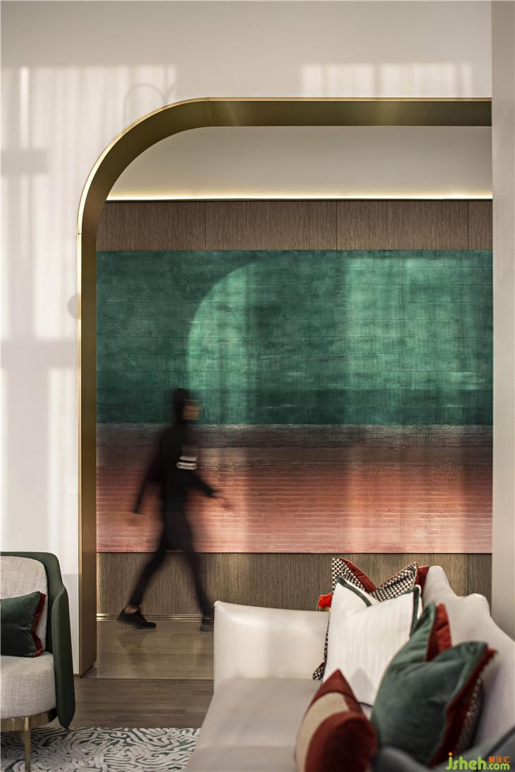 水吧区呼应了翡翠主题,零星翡翠缀满几何装置,以点、线构筑面的意象,愈是简单,愈是呼唤起人与自然的灵魂共鸣。设计师以几何元素凝聚空间,传达美学奢华的生活态度。