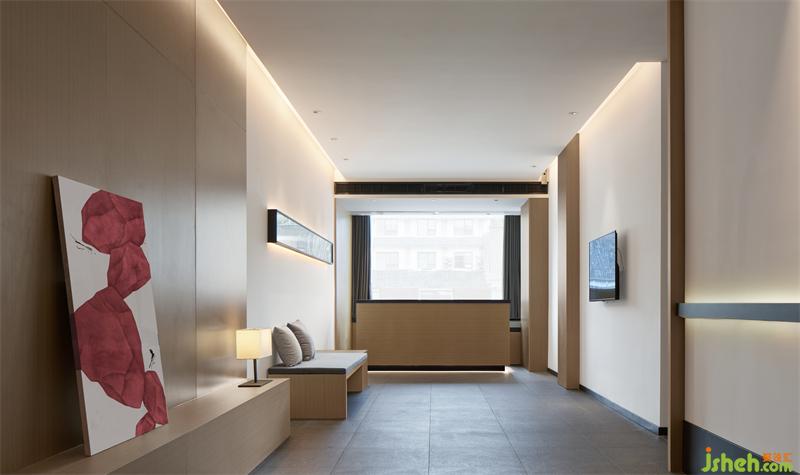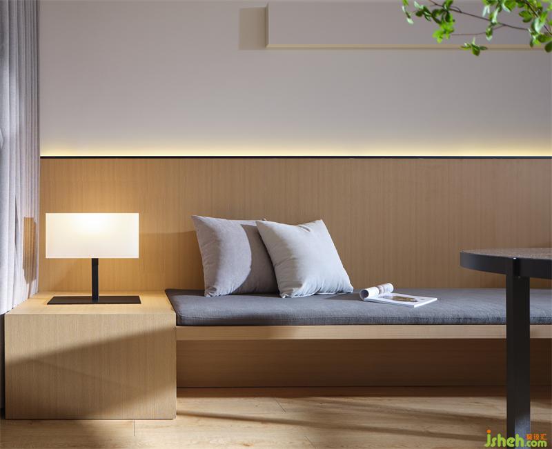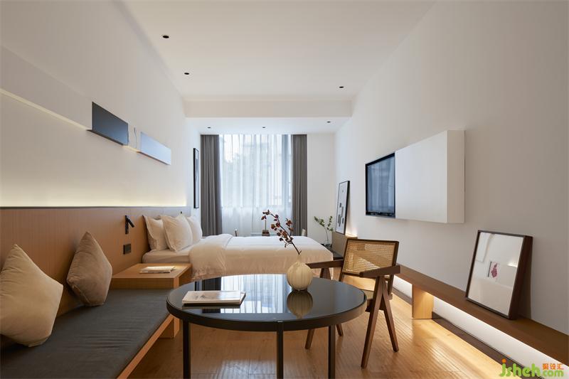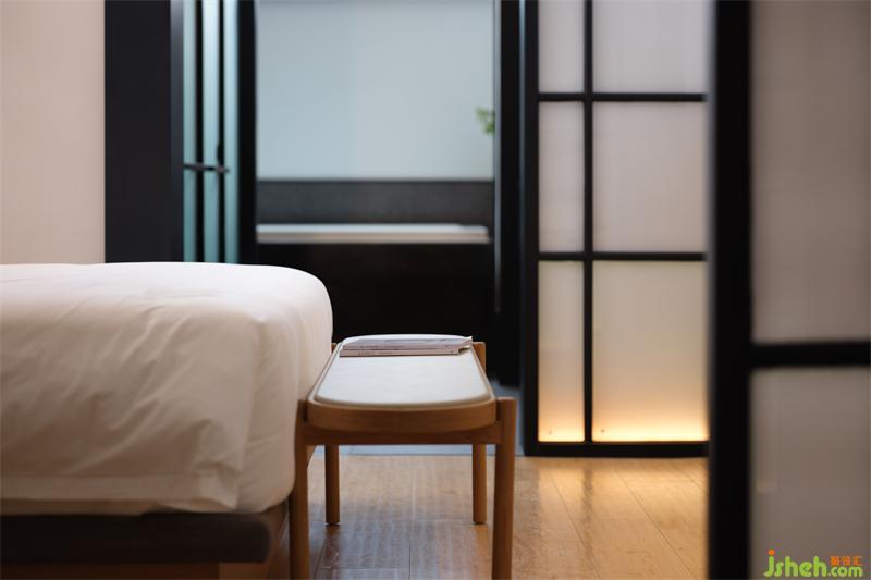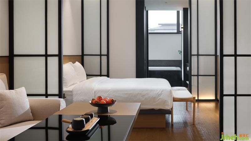 酒店设计于草堂间捕捉灵感,房间室内两侧采用几何造型玻璃屏风分隔功能区,形成层层递进的视觉效果,增加空间内部的对比,在有限的空间内让人感受到空间意境。