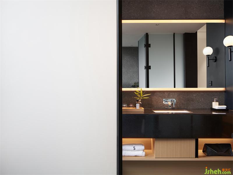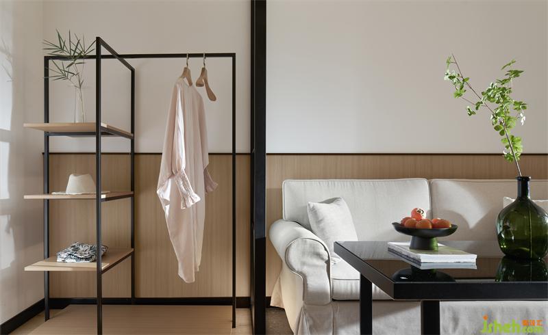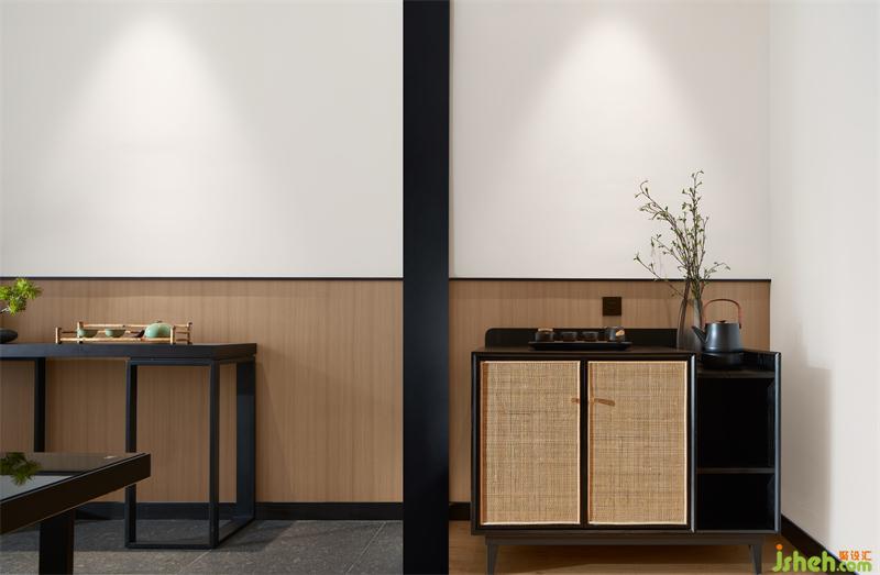走道以利落的黑色线条对空间尽显切割,运用对称美学,既能稳定空间结构,又给予空间空间宁静感,引入氛围。