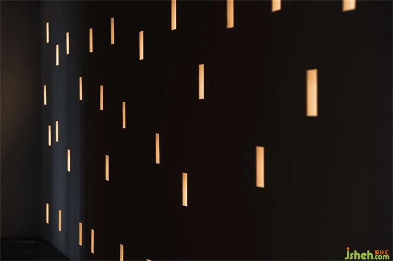水景另一侧采用黑色圆管阵列,以线形镂空的形式呈现,渐隐渐露,为酒店的其它空间做开铺垫。