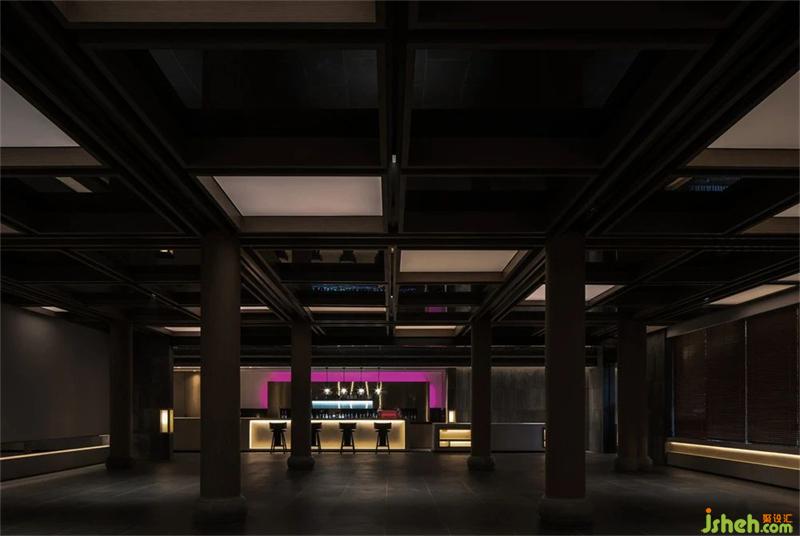 设计保留了室内的仿古圆柱。并在天花造型中引入藻井的概念,用现代设计语言通过变幻的灯光进行重新诠释,构建一种源于结构的力量,一竖一横之间,一转一折之际,赋予独属于传统与现代之间的奇妙境界。