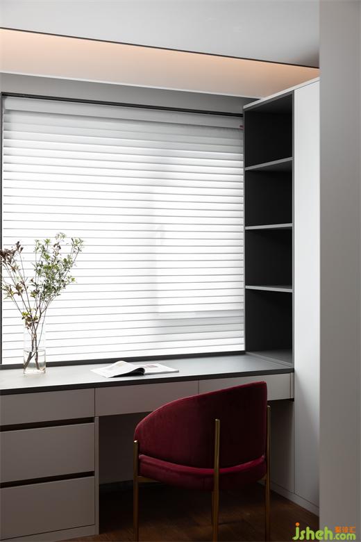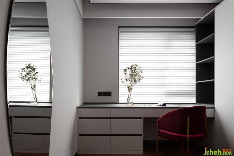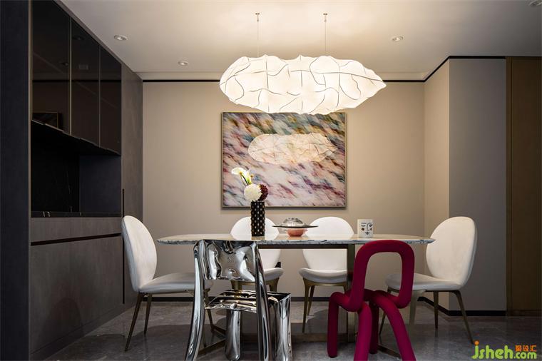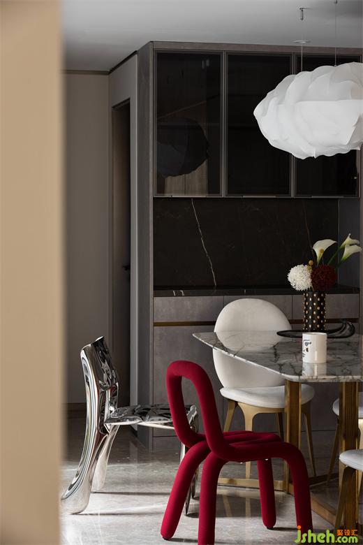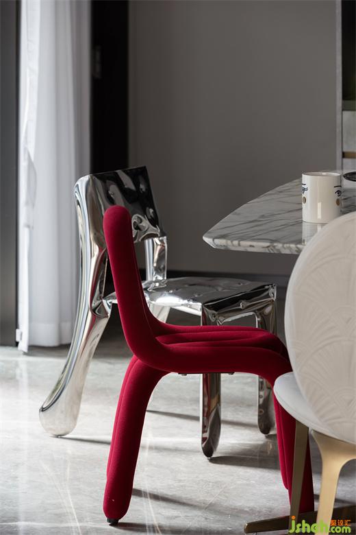 红色和不锈钢材质的餐椅组合,中海望京府复式家装设计营造了集品质、艺术、舒适为一体的轻奢生活方式。一餐一食,一酌一饮,一家人围着餐桌享受美食,偶尔伴随几句嬉笑,绘就了一幅幸福美满的和谐画面。