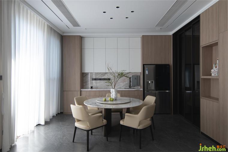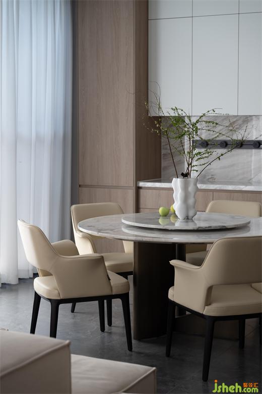 圆形的餐桌,米白色的餐椅,别墅装修设计所有的设定均以生活动线与习惯来模拟并加入丰富的创意量身订做,在这里独自品酌或与亲朋对饮,情思爽然,便是人间乐事。