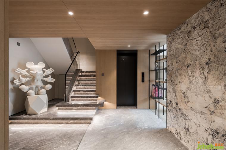 珠海别墅设计楼梯下方的《Snow Angel Mickey》,指在雪地里摆动手脚形成一个天使的轮廓,代表纯真,自得其乐及天马行空的想象力。这个充满活力的造型,将艺术、文化、潮流元素结合, 成为一个艺术跨界的载体。
