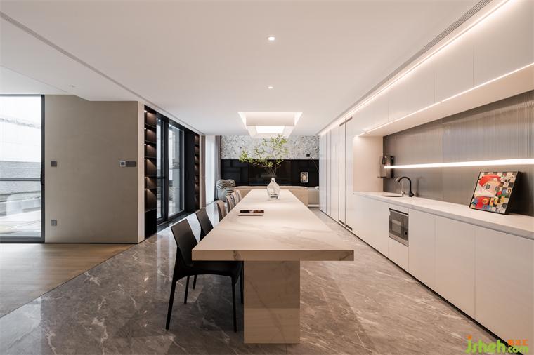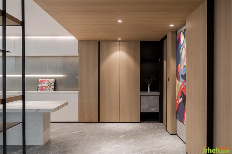 一侧则是西式餐厅空间,简约的吧台,充满着现代感,又不失温暖和舒适,温暖丝丝沁入空间的木纹墙面,可以作为简餐餐桌烘焙等西式料理操作台实用,在这里独自品酌或与亲朋对饮,情思爽然,乃人间乐事。