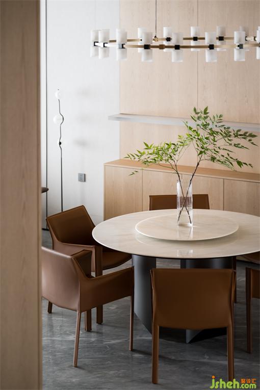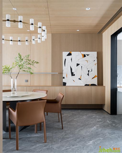 一层客餐厅空间开阔雅致,糅合着秩序节奏与空灵飘逸感,人随境而转,舒适感极佳。富有层次感的色彩搭配度独到的空间裁切、雅致的家装铺陈,都彰显着匠心与考究。没有过多庄重的设计,独特的装饰画、精美的吊灯和别致的植物,为餐厅增添了一份独特的氛围和个性化的魅力。在光影之下盛放静谧如画,演绎着一家人三餐四季的浪漫生活。