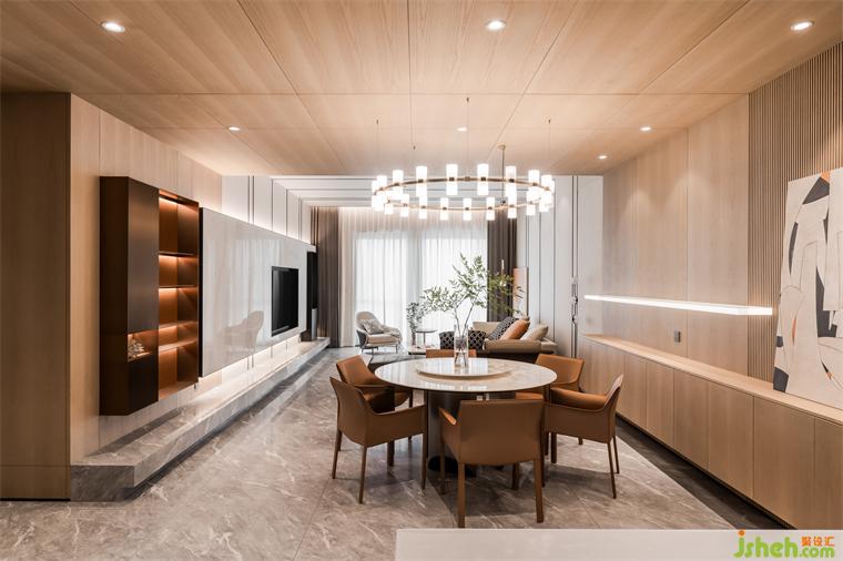 一层入目增加了开放的休闲娱乐区,让过渡空间充满了想象,柜体细节处灯光设计,留白转折拉开层次,或坐或躺也是自在其中。挑空之下,流线型吊灯轻垂错落有致,大理石肌理垂直蔓延,在这里,场景交织下,互动重塑空间意趣。