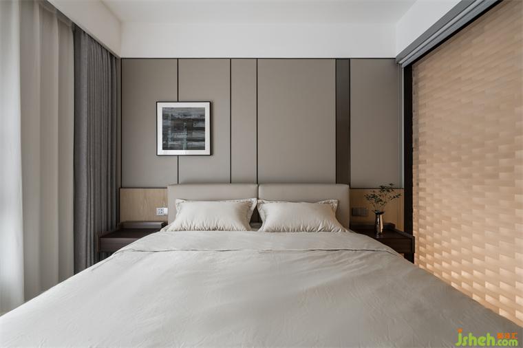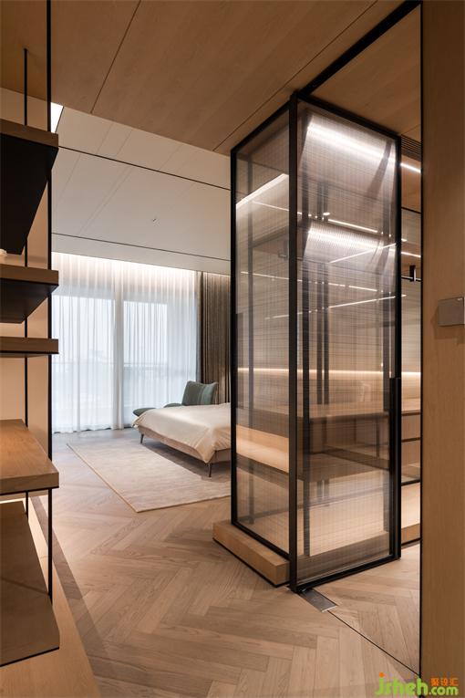 珠海别墅设计次卧室采用淡雅的浅色调,背景墙用金属线条板进行层次的营造,丰盈空间。右侧的玻璃砖光线照入,和光同尘,温暖通透。天光大开的设定,邀入白日里的热烈,暗格里的光景,恰适温柔的夜晚告白。